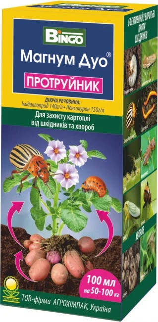 МАГНУМ ДУО — інсектицидно-фунгіцидний препарат контактної та системного дії для комплексного захисту картоплі від хвороб і шкідників. Має тривалий захисний період (до 60 днів) з ефектом стимуляції росту та розвитку рослини. Протравник не впливає на смакові якості картоплі, а також є безпечним для корисних комах і довкілля.